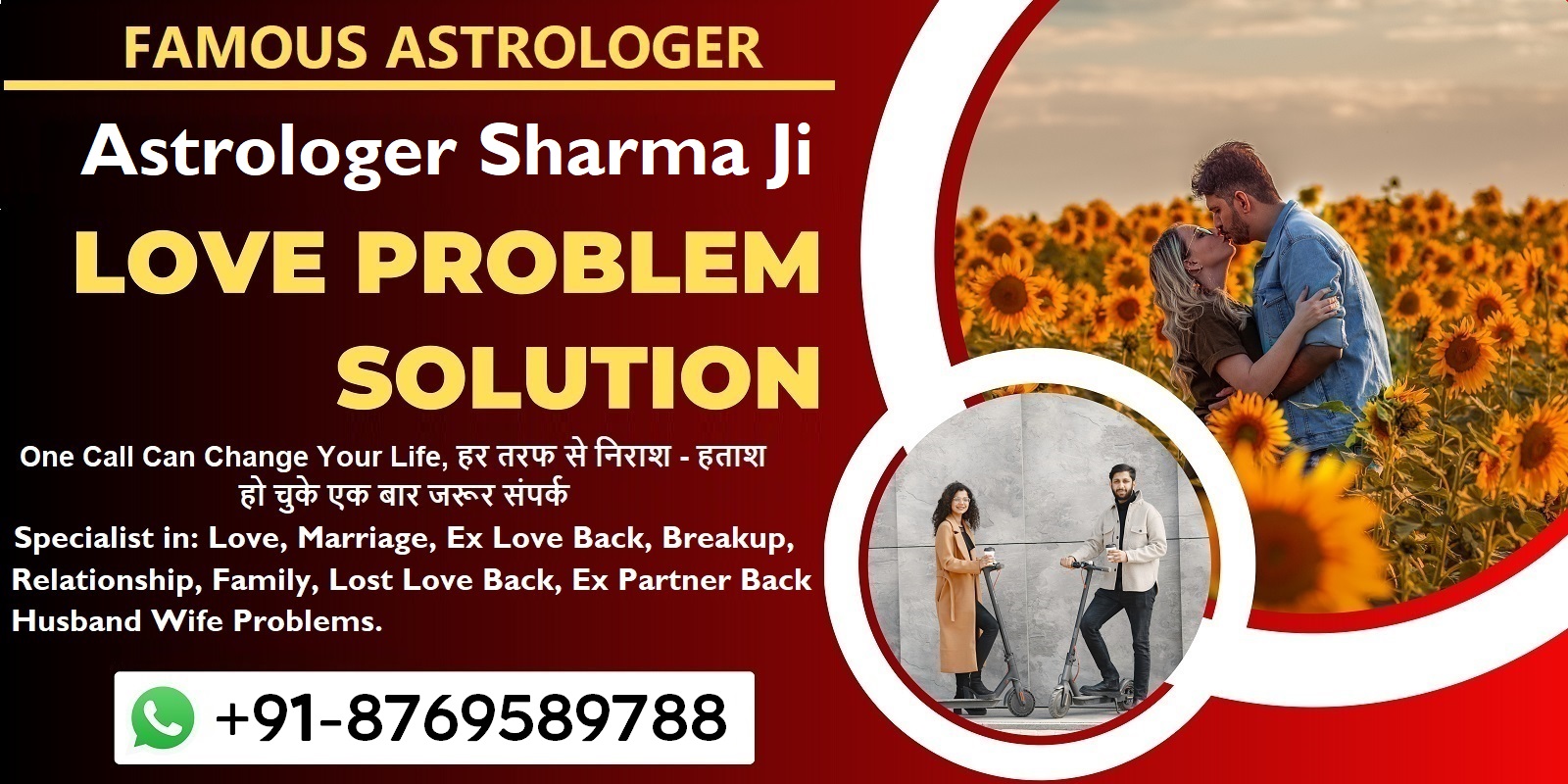 हर तरफ से निराश - हताश हो चुके एक बार हमारे से जरूर संपर्क करे। हमारा वादा है आप से, आप निराश नही होंगें। खोया प्यार पाए, प्रेम विवाह, शादी मे समस्या, ग्रह कलेश, पति पत्नी मे अनबन, पारिवारिक समस्या, वीजा आदि।!